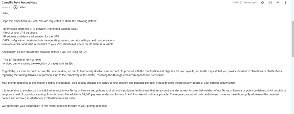 “It has been recently observed in your 2 Step Pro Phase 1 challenge account that your trading activity reflects behavior associated with gambling approach as 100% of the total account profit was made on just 2 trades. Because the trading pattern observed closely resembles gambling behavior, we regret to inform you that we are denying your accounts. “
